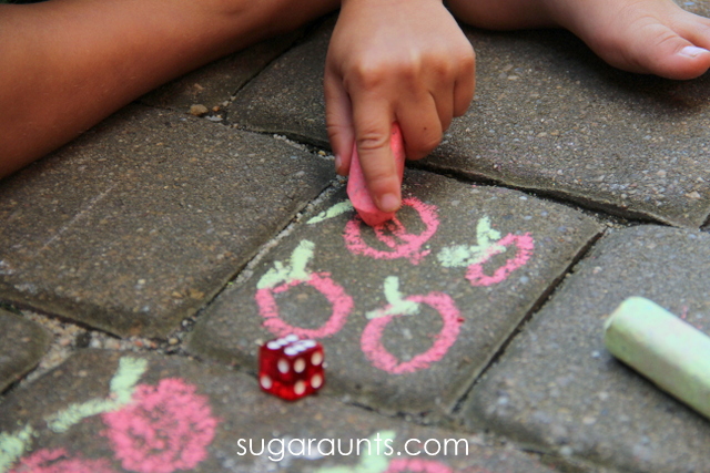 dados para esta actividad. Una tarde llevé a los niños a la acera y dibujé un montón de formas de manzanas. Estábamos listos para jugar.