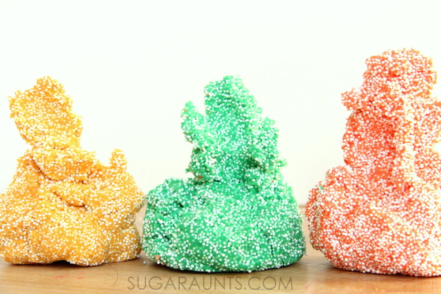 Advertencia de desorden: ¡Esta masa es DESORDENADA! Más bien, el relleno es la parte desordenada. Cuando moldees y juegues con este floam, los pequeños trozos de relleno se desprenderán de la masa. Juega con esta actividad sensorial en un recipiente grande y poco profundo o sobre un mantel extendido en el suelo.