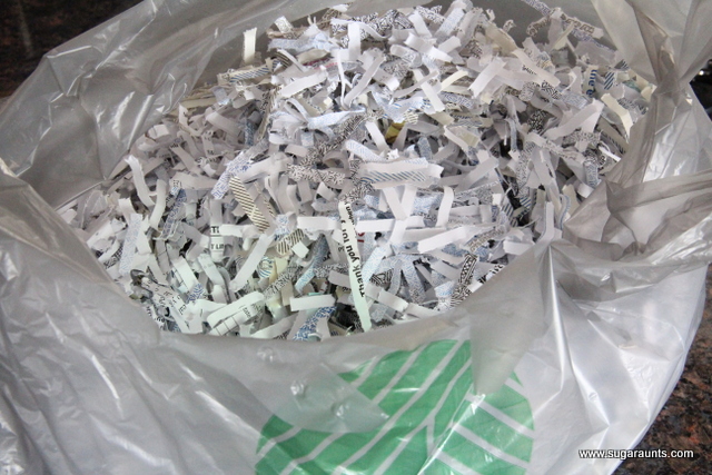En primer lugar, coloca el papel triturado en la bolsa de plástico. Usamos sólo correo basura normal, papel de impresora y periódicos reciclados y lo colocamos en una bolsa de plástico de la tienda.