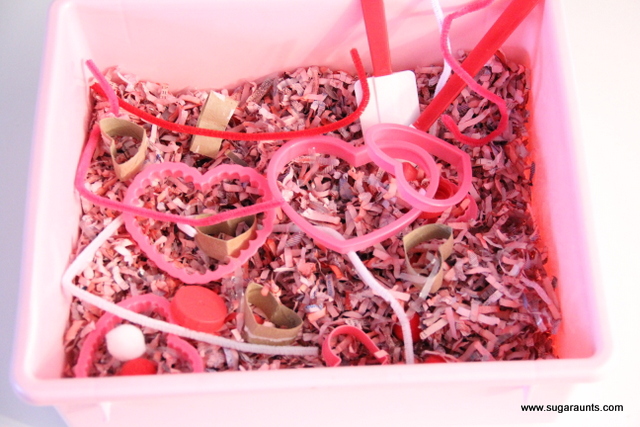 Este contenedor sensorial fue una actividad para el día de San Valentín para nosotros, pero el contenedor sensorial de papel triturado se puede utilizar con cualquier tema.
