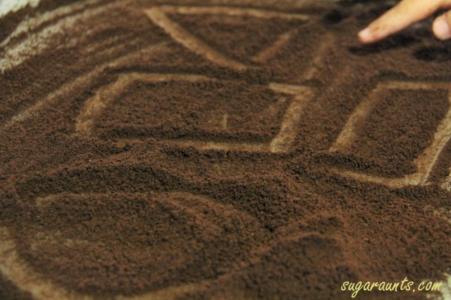 Vertí los posos del café en una tabla de cortar blanca para conseguir el máximo contraste e hice que la hermana mayor practicara algunas letras minúsculas. ¡Le encantaba esto! El negro sobre blanco deja ver las letras. ¡Se sentía muy especial haciendo esta actividad porque podía jugar con el café!