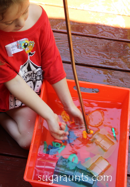 Sacamos todos los vasos de colores del agua e hicimos que los niños “pescaran” las letras y las pusieran en los vasos correspondientes.