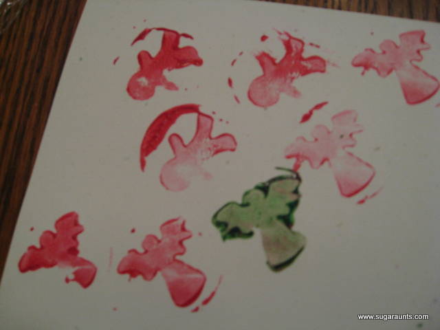 fueron un gran éxito para la hermana mayor. Y en serio, es muy fácil de hacer. Hicimos este pequeño proyecto mientras se hervían las patatas para nuestra cena. Somos grandes fans del arte EASY. En nuestra casa, lo simple es lo mejor. ¡Y estos estampadores de Navidad fueron definitivamente fáciles! Serían las tarjetas navideñas perfectas para los niños (y sencillas para hacer suficientes tarjetas para toda la familia en una tarde de manualidades). ¿No le encantaría a la abuela recibir su regalo envuelto en papel con estos estampados navideños? ¡Una hoja de papel de envolver de una tienda de dólar con estos estampados en el reverso sería un gran envoltorio para cualquiera! Una página de estos sellos navideños sería incluso un gran regalo como pieza de arte para alguien especial.