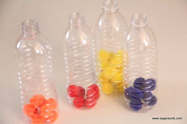 To get the pom poms out of the bottles, I was able to pull them out quickly. The little kids were not able to get them out, but it was not too difficult for Big Sister.