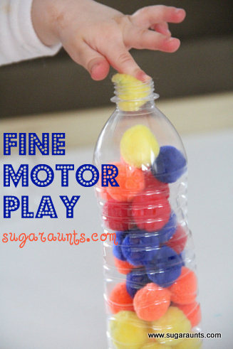Bilateral coordination for toddlers is part of development and this plastic bottle and craft pom pom activity is a great tool to support this sensory motor skill.