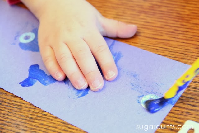 Picking up the glitter and sprinkling activates the small muscles of the hands~ the intrinsic muscles. These are the muscles that allow for strength in the arches of the hands and are very important for endurance in coloring and writing with a pencil. The glitter stuck on the paint and made very sparkly snowmen!