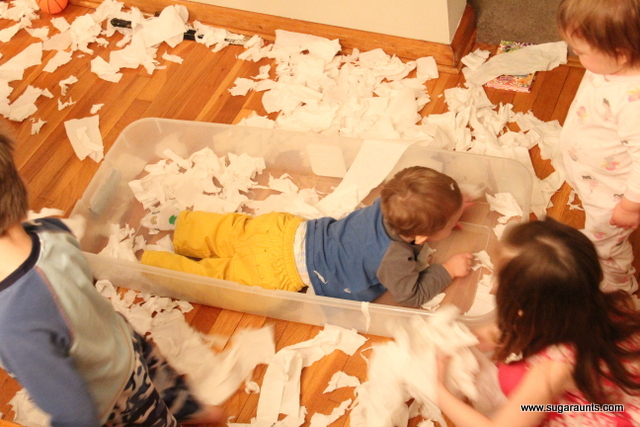 With these two ingredients, there are many opportunities for tactile sensitivity challenges, and each child can experience sensory exploration at a level that suits their preferences. Some children may enjoy experiencing the dry texture of the toilet paper. (See the kids below…they sure enjoyed this texture.)