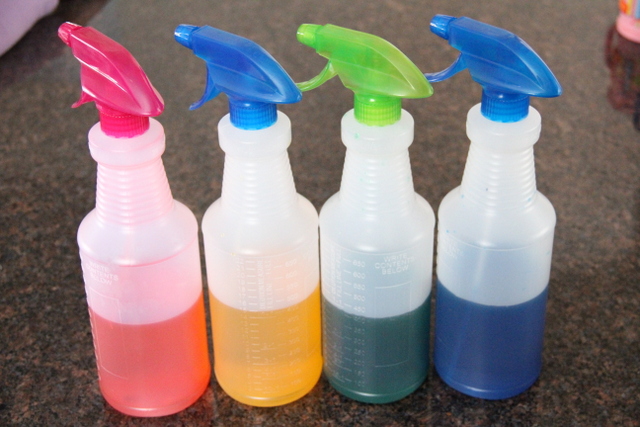 Los frascos de spray son de la tienda de dólar. Cuando vi las bonitas tapas de colores de las botellas, cogí cuatro de ellas… ¡veo muchos juegos divertidos con el spray en nuestro futuro!