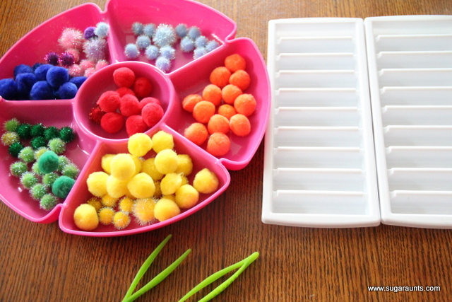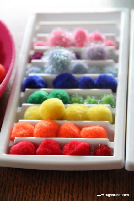 This rainbow sort activity is easy to set up. All you need is colorful craft pom poms and an ice tray or two. The ice trays are the perfect size for the crafting pom poms.