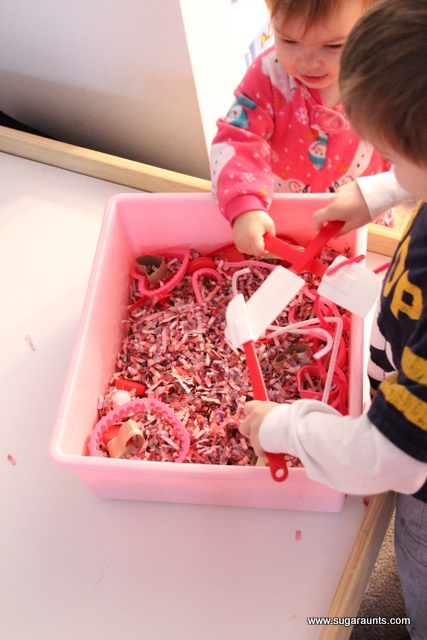 Había muchos colores y texturas para explorar en este contenedor sensorial.