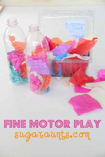 We have a bunch of little tissue paper squares in our craft supplies. Put them next to a couple of empty plastic bottles, and the kids know what to do!