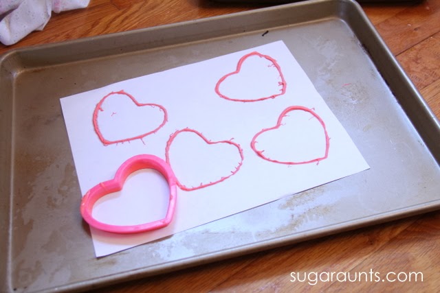 When the hearts dried, they were a pretty stamp. However, this is not something that can be saved to decorate cards or hung on the wall. The hearts flaked away if you touched them. Maybe a little glue added would help to preserve these pretty hearts? We’ll try that next time!