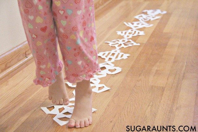 4. Giro de la bola de nieve: ¡enróllate como una bola de nieve y prepárate para girar! Utiliza un trozo grande de cartón para divertirte bailando al estilo del muñeco de nieve. Enséñale a tu hijo a girar y moverse sobre el cartón y a deslizarse en todas las direcciones y planos. Como reto, dibuja o pinta copos de nieve en la cartulina. Son objetivos para las manos y los pies y proporcionan una planificación visual motora, seguimiento visual, coordinación mano-ojo y componentes de cruce de la línea media. Puedes numerar los copos de nieve para incorporar más habilidades. ¡Esta es una actividad que seguramente inspirará sonrisas!