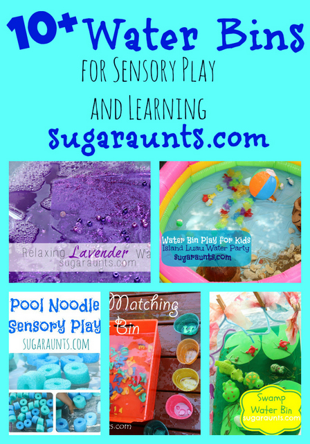 Water sensory bins and tables use any basic water table or can be set up with just a large tote bin, a small food casserole dish, storage bins, or any container that will hold water. The nice thing about these water play ideas is that you can create any theme or use any type of manipulative to the water to engage kids attention and interest. Place the bin on the floor for floor play and core strengthening or position the bin on a table surface for a table set-up.